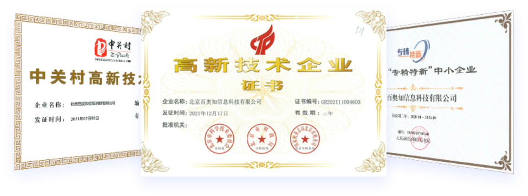 百奥知拥有89项软件著作权证书,22项国家认可机构软件测评报告,13项商标注册证书,已获得信息安全等保三级认证、ISO系列认证、及其他行业与国际认证