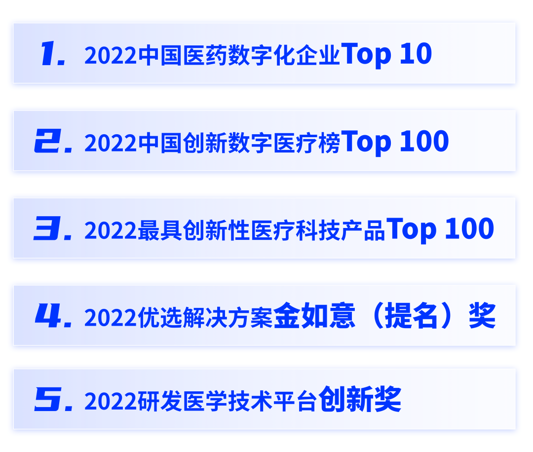 百奥知深耕医药研究数智化领域16年,深受行业与客户的信任与认可,取得了诸多优异成绩。仅2022年,百奥知就荣获了动脉网、健康界与亿欧大健康等行业权威颁发的多项证书。